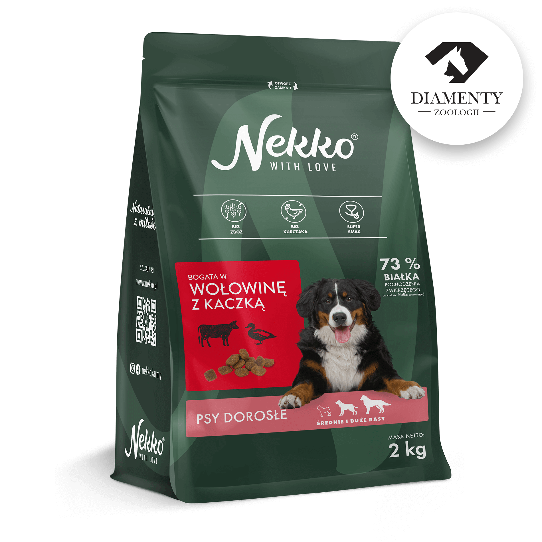 Nekko to pełnoporcjowa, sucha karma dla dorosłych psów, która wyróżnia się wysoką zawartością białka pochodzenia zwierzęcego oraz wyjątkową smakowitością. Karma pozbawiona jest kurczaka, zbóż, kukurydzy oraz soi. Nie znajdziesz w niej również szkodliwych konserwantów i sztucznych barwników.